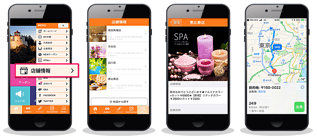 店舗情報ページには、画像、説明や住所、地図、ナビゲーション、自動電話、各サイトへのリンクが可能。地図から店舗を探すページでは、地図上に全店舗位置のピンが立ち、自分の位置から近い順番に表示され、お店までの距離とルート検索が可能。店舗ごとにプッシュ通知も可能です。